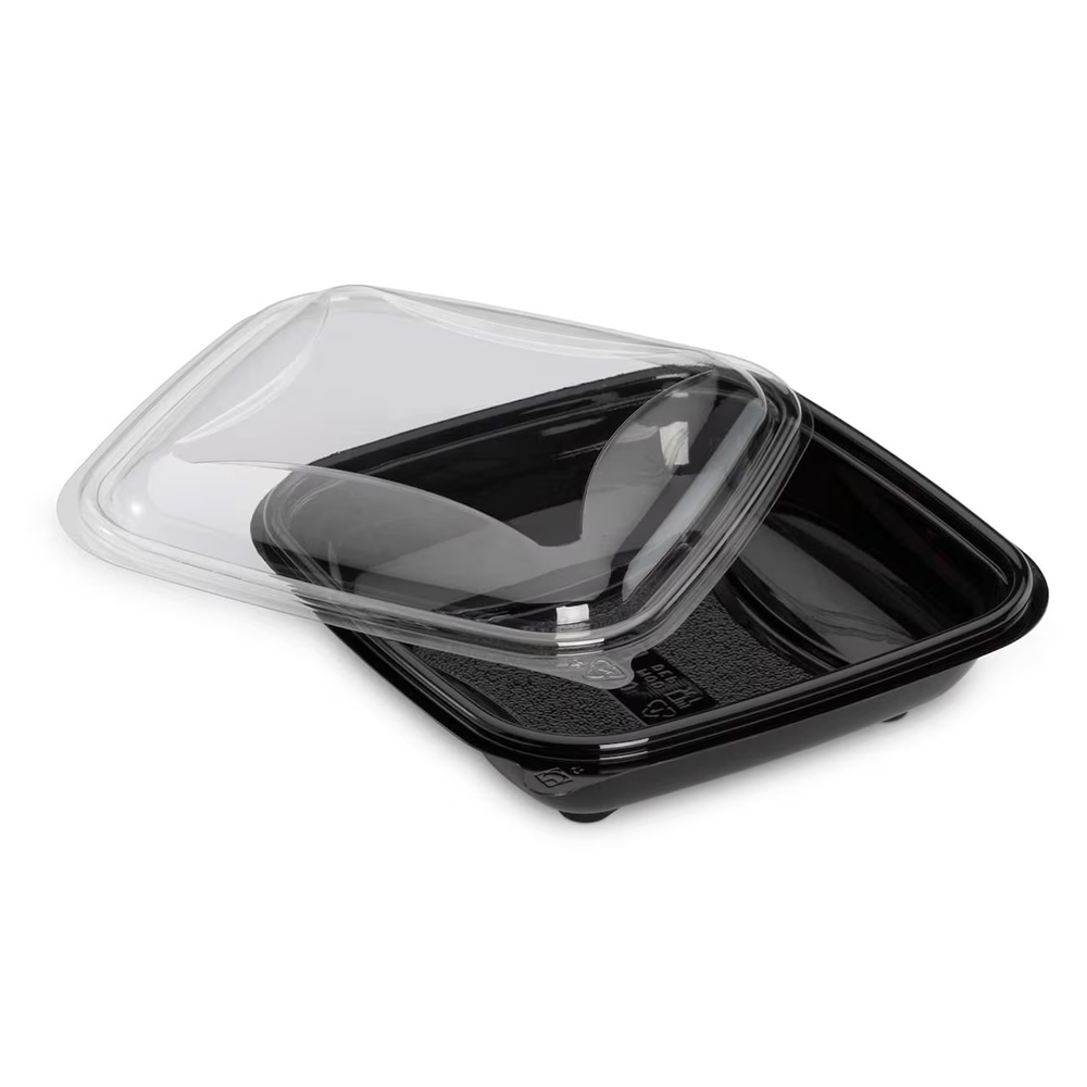 Boîte salade 370 ml en plastique noire » crudipack » + couvercle transparent 16 x 16 x h 4,5 cm carton de 320 boîtes